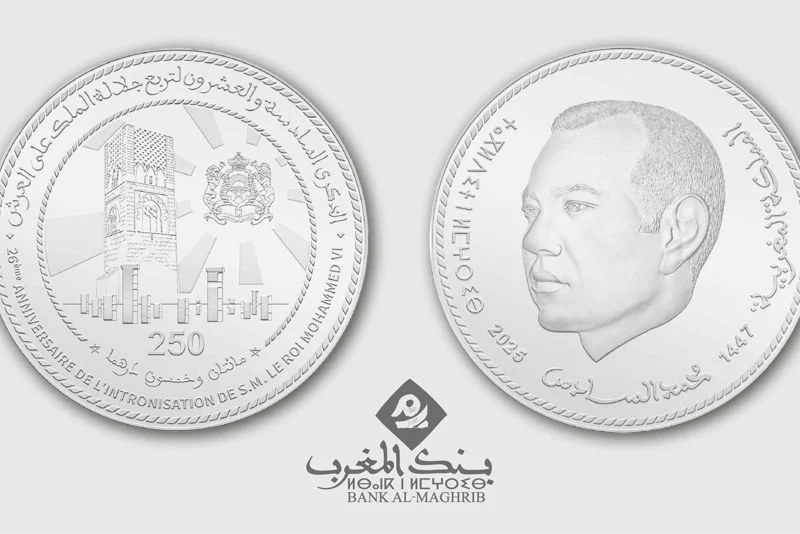 أصدر بنك المغرب، اليوم الثلاثاء، بمناسبة الذكرى السادسة والعشرين لتربّع الملك محمد السادس على العرش، قطعة نقدية تذكارية جديدة من فئة 250 درهما، في خطوة رمزية تعكس تخليد المؤسسة النقدية الوطنية لهذه المناسبة البارزة في التاريخ المعاصر للمملكة.